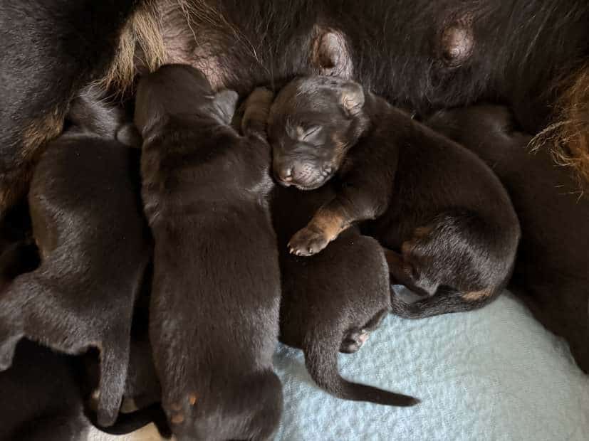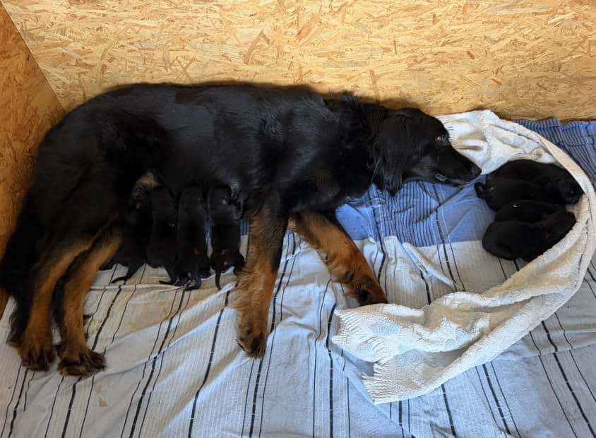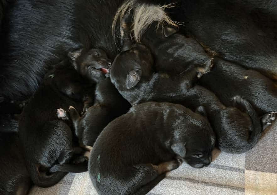 Ein Nest voller Glück! Es fiepst und wuselt wieder in der Wurfkiste vom Pohlsee: Francas Welpen sind gleich putzmunter!  Sie hat wirklich alles gegeben und 3 Rüden und 7 Hündinnen zur Welt gebracht, pünktlich zum 20.Februar.  Alle sind gesund und munter und von der Fellfarbe schwarzmarken. Der Appetit der neuen Erdenbürger war sofort groß und die Milchbar wurde gleich eröffnet.  Jetzt ist, bei so einem großen Wurf,  ein Hochleistungsjob angesagt für alle Beteiligten. Aber für so viel Welpenglück tut man doch alles!