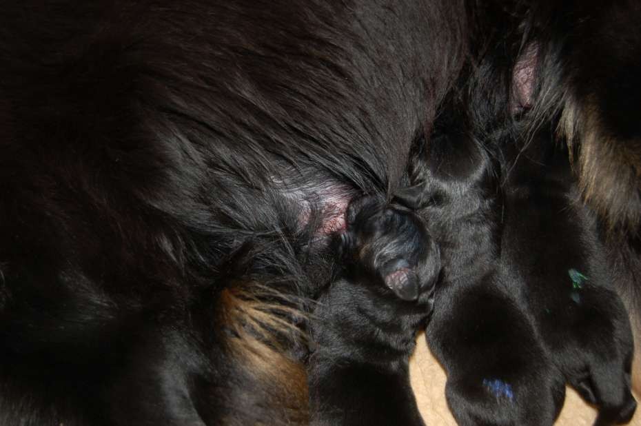 Chenna ist voll in ihrer Mutterrolle aufgegangen und die Welpen entwickeln sich prima. Zu ihren Geburtsgewichten von um die 500 g haben alle zugelegt. Kein Wunder, hängen sie doch permanent an der Milchbar. Besonders der Rüde ist ein kleiner Schluckspecht. Muss sich ja auch in dem Mädchenhaufen durchsetzen, typisch 😉